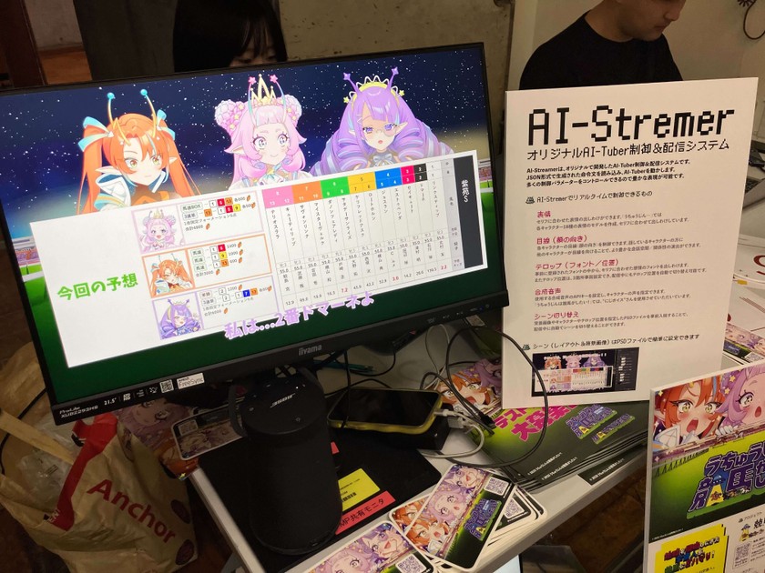 毎週、週末に開催されるレースの予想配信を行うAI-Tuberで、すべてのセリフ、レース予想、表情の選択、目線の操作、テロップの表現、シーンの切り替え、合成音声など、すべてがAIによる生成 / 自動制御とのことです。