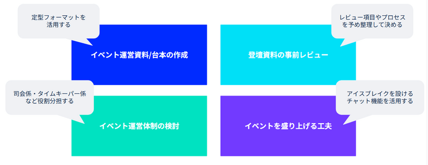- 司会・タイムキーパー・サポートメンバーの体制を事前に設計しておくと、トラブル発生時にもスムーズに対応できます。