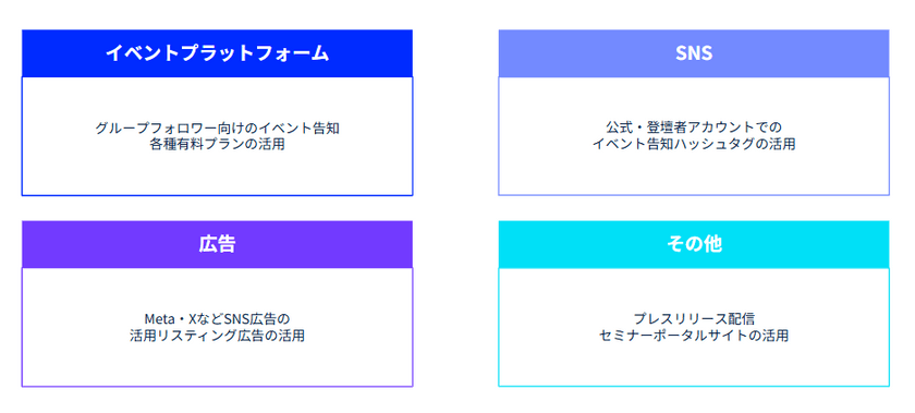 - イベントプラットフォームでの周知に加え、SNS投稿、広告、プレスリリースなどを組み合わせることで集客数を最大化できます。規模や予算に応じて選択しましょう。