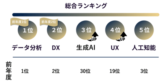 一方で、データ分析やDXといったテーマは引き続き上位を維持し、継続的な重要性が確認できます。