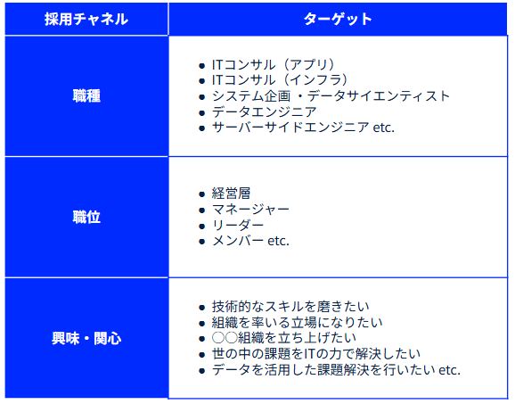 - 例:認知度向上、特定職種との接点づくり、カルチャー理解の促進など