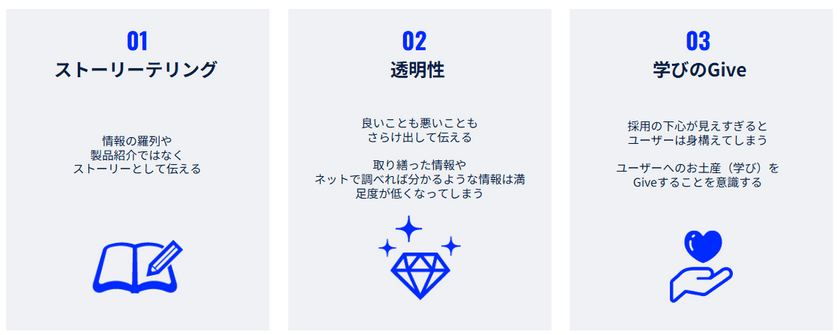 - 例:候補者に「新規開発に挑戦できる環境がある」と理解してもらい、採用母集団の形成につなげる。