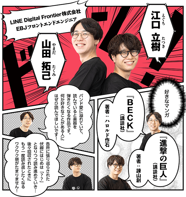 それを象徴するのが、2023年に展開された「連載プロジェクト」だ。今回は、ebookjapanのフロントエンドエンジニアである山田 拓己(やまだ・たくみ)氏、江口 立樹(えぐち・たつき)氏のお二人に、プロジェクトの内容やその中でフロントエンドエンジニアが担う役割についてお話をうかがった。