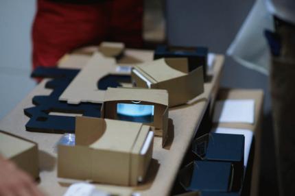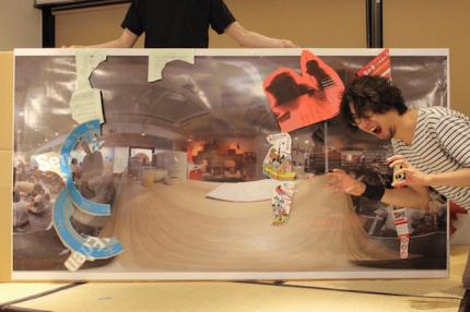 段ボールでできた視覚装置(スコープ)=「ハコスコ」。ハコスコを使って、開発者の脳科学者藤井直敬さんとともに、手作りの拡張現実を体験するワークショップです。