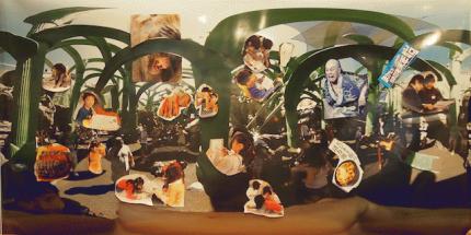 360°写真を大きな長方形にプリントしたものに、自分や家族、友達の写真を貼り、またいろんな紙の素材のコラージュや落書きなども加えて、それをもう一度写真に撮って、スコープに入れて見ます。スコープに入れると、あたかも近距離のプラネタリウムにいるかのような、全天球の映像を見ることができます。