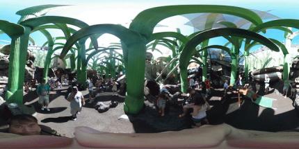 ハコスコを覗くと、パノラマで撮影された映像の世界が体験できます。従来の映像が、カメラの向いている方向だけを撮影していたのと比べ、パノラマカメラは360°全方向の映像を記録します。ハコスコでは、静止画であっても動画であっても、360°の全方位に収められたパノラマ空間の好きな所を自由に見ることができます。現実とは異なるパノラマ空間に簡単にジャンプでき、まるでそこに行ったかのように体験することができるのです。