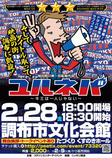 ※「東京国際フットボール映画祭2015」(観客賞受賞作品)、「ヨコハマフットボール映画祭2015」(審査員特別賞、観客賞受賞作品)では、全日程前売完売!そこで、一人でも多くの方に見ていただきたく、上映イベントを開催することとなりました。Jリーグ開幕1週間前に、みんなで思いっきり盛り上がりませんか??