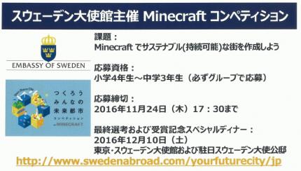 会場ではMinecraft建築ワークショップ(予約制・無料)を開催します。テーマは『つくろうみんなの未来都市』。建築作品コンペのファイナリスト100名には、Minecraftの母国、スウェーデンの大使公邸(東京)でのスペシャルディナー(12/10)にご招待!