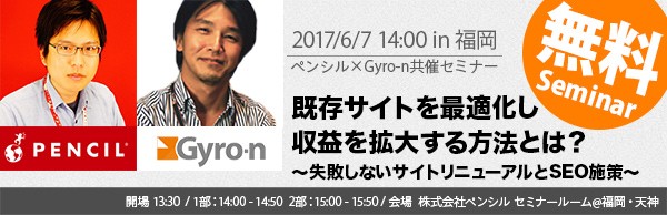 このセミナーでは、ウェブサイトの問題点の見極め方からその改善方法まで、効果的なサイトリニューアルの進め方を株式会社ペンシル様よりご紹介いただきます。さらに第2部では検索順位変動や競合サイト分析から問題点を見極め、検索順位upに繋げるSEOのPDCAの回し方を解説する、恒例のGyro-n SEOセミナーを福岡で初開催します。