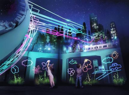 『TOKYO ART CITY by NAKED』には楽しい仕掛けが盛りだくさん。高さ4.3mの東京タワーには実際に登れる展望台があり、目の前にジャンボジェット機が飛び、色鮮やかに変化を続ける“東京”を見下ろせます。渋谷のビルの壁は、指で自由に絵が描けるデジタル落書きコーナーに。