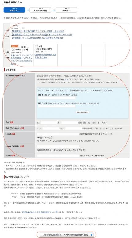 <STEP3>申込ページが表示されます。「参加を希望するセッション」「お客様情報」「アンケート回答入力」を選択して、ページの最下部にある「上記内容に同意の上、入力内容の確認画面へ進む」ボタンをクリック