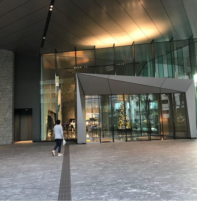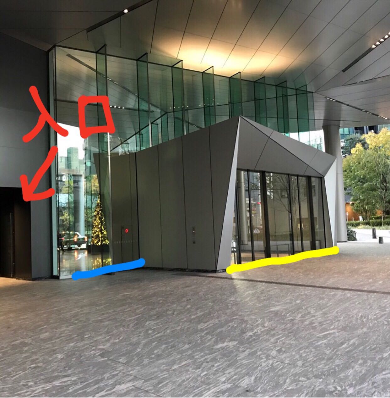 当日はビルセキュリティの関係で、ビル正面入口(黄色線)の自動ドアは施錠されております。