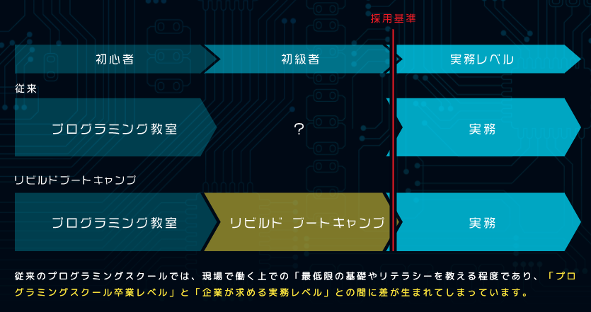 プログラミングスクールを卒業したけど、転職先が見つからず困っている」という話を、地方圏で耳にすることがあります。これは初心者向けプログラミングスクール卒業レベルでは、企業の求める採用基準までには達していない場合が多いことと、大都市以外の地方都市に初級者向けのプログラミングスクールがあまり存在しないこと、就職までのサポートを行っているスクールが少ないことが原因だと考えられます。リビルドブートキャンプでは、実務レベルを目指す初心者向けプログラミングスクール卒の方向けに、開発現場に入れるようになるためのカリキュラムを用意しています。