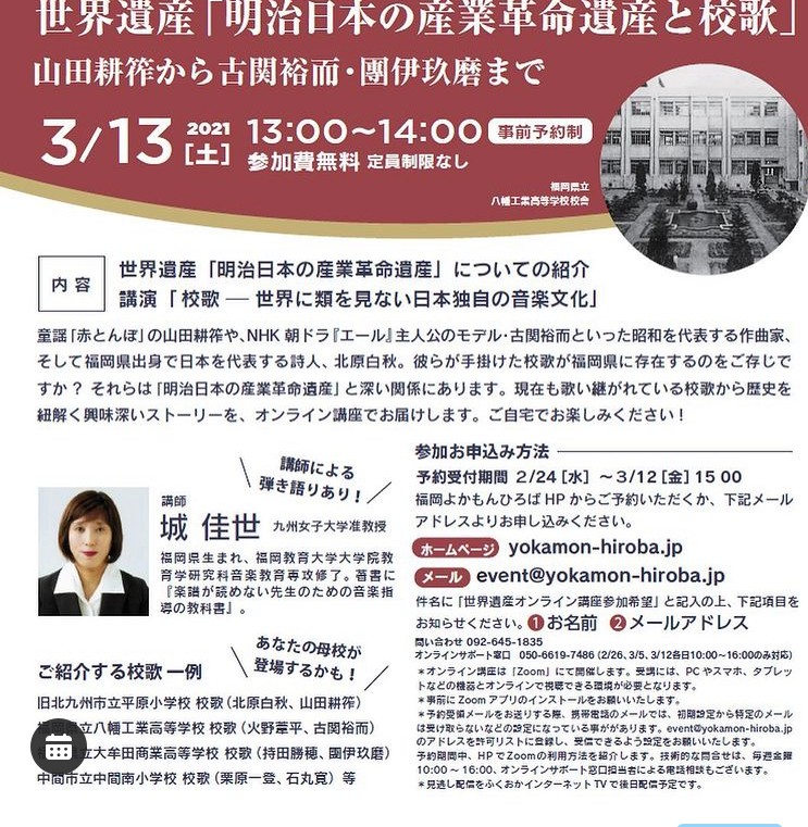 この度、オンライン講座『世界遺産「明治日本の産業革命産と校歌」』を開催いたします!