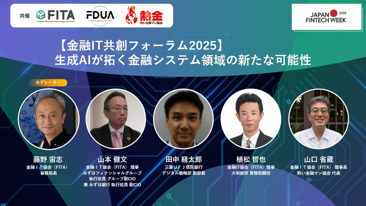 2025年3月4日(火)、特定非営利活動法人金融IT協会(FITA)と一般社団法人金融データ活用推進協会(FDUA)と熱い金融マン協会共催の「金融IT共創フォーラム 2025:生成AIが拓く金融システム領域の新たな可能性」をオンオフハイブリッドにて開催いたします。当日は、金融機関のシステム部門における生成AIの活用について議論します。最後には、オフライン限定での懇親会を開催する予定です。