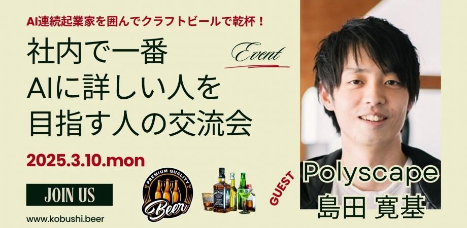【3月10日(月)19:00~】社内で一番 AIに詳しい人を 目指す人の交流会①AI連続起業家を囲んでクラフトビールで乾杯!/ ゲスト:島田寛基(Polyscape代表)