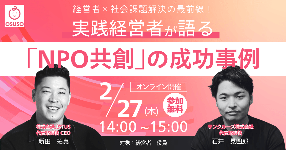 本セミナーでは、“おすそわけ”で社会を変えるプラットフォーム 「OSUSO」創業者 と、実際にOSUSOに参画し 事業と社会課題解決の相乗効果を生み出しているサンクルーズ株式会社代表 が対談。