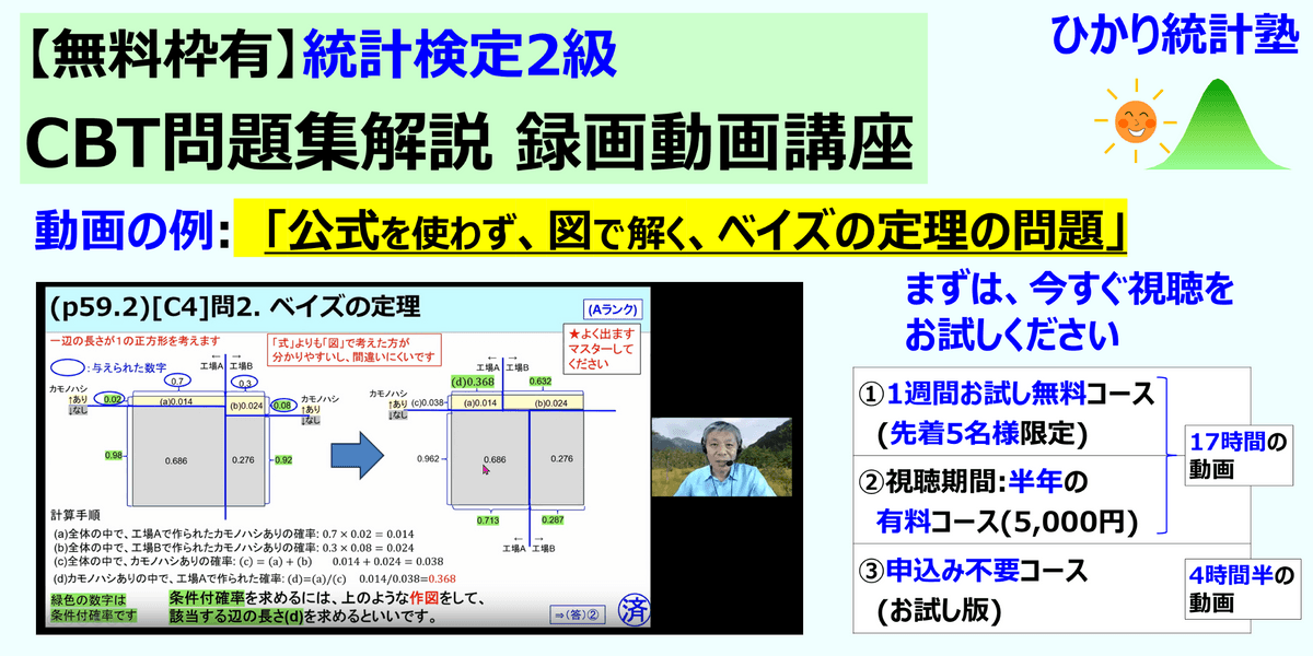 さらに「統計検定2級 CBT問題集解説 録画動画講座」に興味を持たれた方は、是非、(無料)お試しサイトをご覧ください(=③申込み不要コースです)。