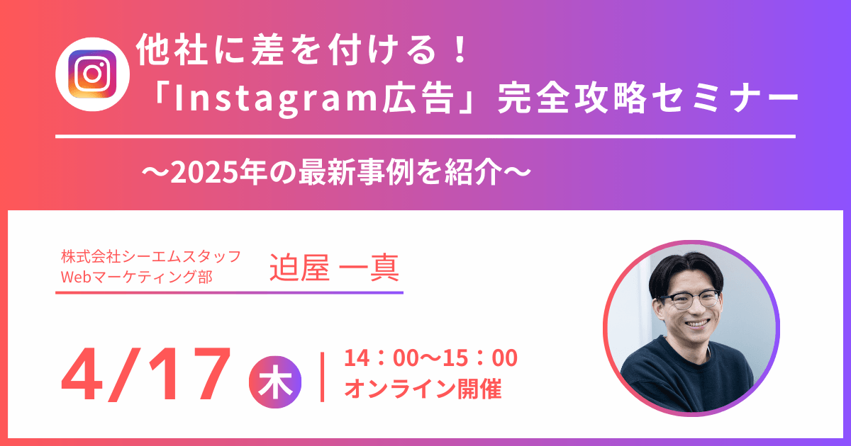 本セミナーでは、戦略立案からInstagram広告の運用、運用結果の分析、改善のご提案まで一貫してお客様のサポートを行っている株式会社シーエムスタッフが「Instagram広告」で成果を上げる方法を徹底解説します!