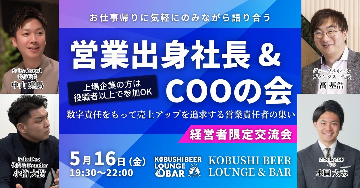 【5月16日(金)19:30~】営業出身社長&COOの飲み会【上場企業で予算決裁権をお持ちの方は役職者以上で参加OK】