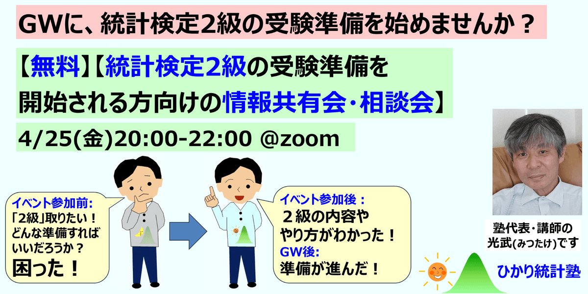 ひかり統計塾では、統計検定2級に関するzoom講座や録画動画講座を提供しております。すでにご利用の方がおられ、その方々に、講座で統計検定2級の内容を解説したり、様々なお困りごとを聞いたりしております。そのような経験に基づき、本イベントを開催いたします。