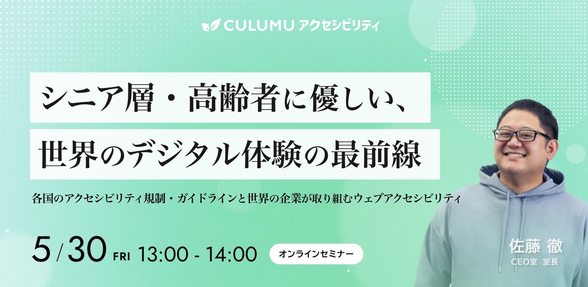 | 13:10 - 14:00 | セミナー / シニア層・高齢者に優しい、世界のデジタル体験の最前線 〜各国のアクセシビリティ規制・ガイドラインと世界の企業が取り組むウェブアクセシビリティ〜 |