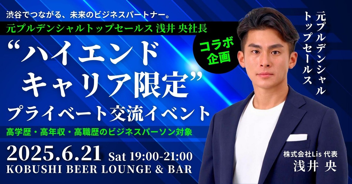 【6月21日(土)19:00~21:00】渋谷でつながる未来のビジネスパートナー。元プルデンシャルトップセールス浅井央社長コラボ企画“ハイエンドキャリア限定” プライベート交流イベント