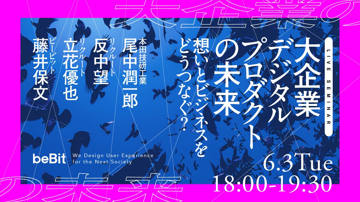 今回は、ビービット藤井保文がファシリテーターを務めながら、本田技研工業デジタルラボの尾中さん、リクルートでプロダクト開発を担当されている立花さんと反中さんにご登壇いただき、「大企業のデジタルプロダクトが、想いと会社の責任のバランスをどのように取りながら、未来を作っていくのか」というテーマでディスカッションしていきたいと思います。