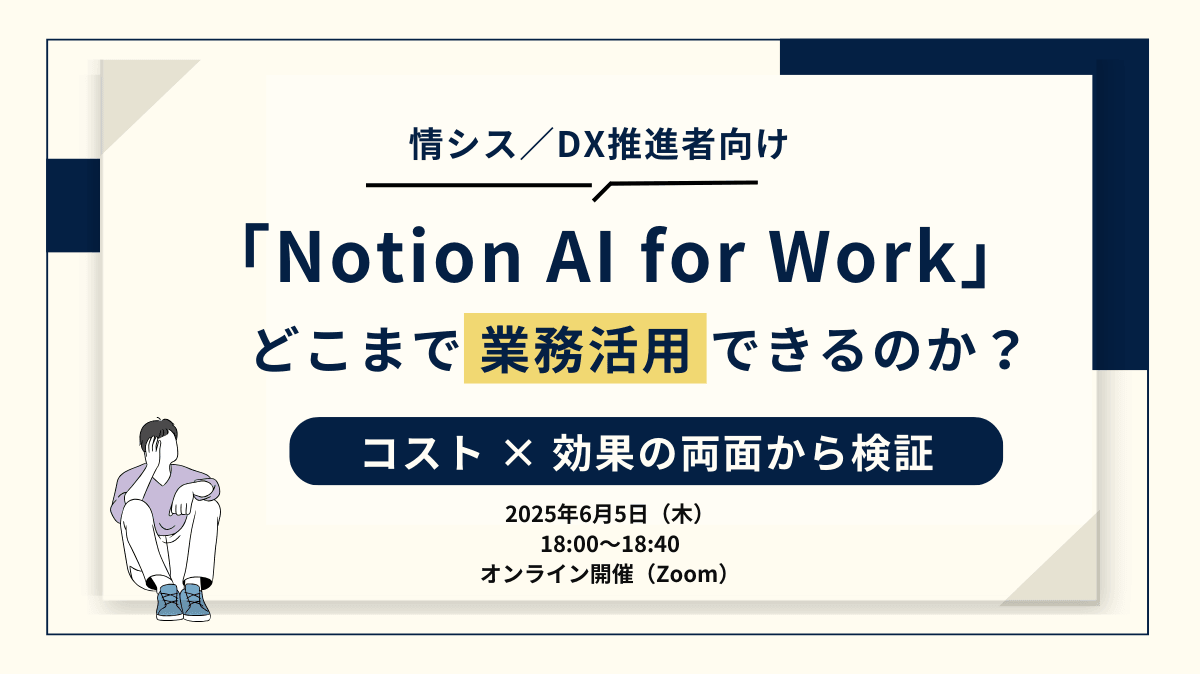 本ウェビナーでは、Notion AI for Workの各機能がどこまで業務活用できるのか、「コスト」と「効果」の両面で検証した結果をご紹介します。情報システム部門やIT管理者の皆さまが気になる「セキュリティ」や「ガバナンス」の情報も解説するので、ぜひお気軽にご参加ください。