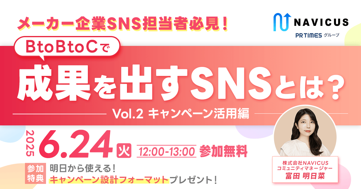 SNSを通じて企業様や地方自治体様のコミュニケーション支援サービスを提供する株式会社NAVICUS(本社:東京都千代田区、代表取締役:武内 一矢、以下:NAVICUS)は、メーカー企業のSNS・マーケティング・広報ご担当者様を対象にした無料ウェビナー「メーカー企業SNS担当者必見!BtoBtoCで成果を出すSNSとは?〜Vol.2 キャンペーン活用編〜」を、2025年6月24日(火)に開催いたします。