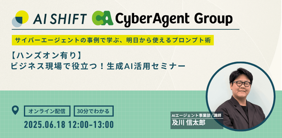 株式会社サイバーエージェント(本社:東京都渋谷区、代表取締役:藤田晋、東証プライム市場:証券コード4751)の100%子会社で、生成AIリスキリング支援を提供する株式会社AI Shift(本社:東京都渋谷区、代表取締役社長:米山結人)は、サイバーエージェント社内での実践事例をもとに、生成AIの基礎から実際の活用方法を学べるオンラインセミナーを開催いたします。