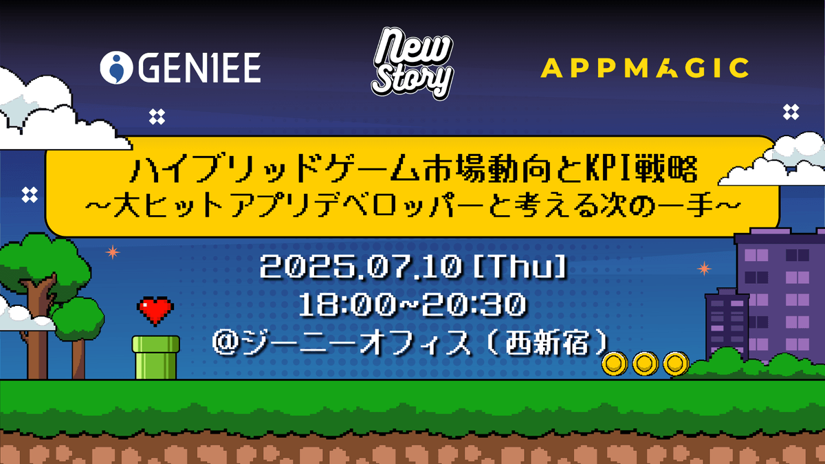 登壇ゲストには大ヒットアプリデベロッパーのNew Story様をお招きし、ハイブリッドゲーム開発のポイントをご紹介します。 また、AppMagic様にはグローバルの市場動向で成功するための広告出稿戦略についてお話しいただきます。