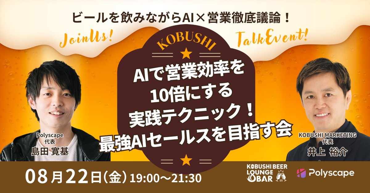 今回は「AIで営業効率を10倍に目指す」がテーマ。あらゆる作業をAIツールで爆速自動化してしまうPolyscape島田氏と、AI×リモート秘書で鬼のように生産効率をあげるKOBUSHI MARKETING井上による飲み会(勉強会ではありません)。AIビギナーから上級者まで、現場で活かせる超実践的AI活用術を、お酒片手に語り合いましょう。