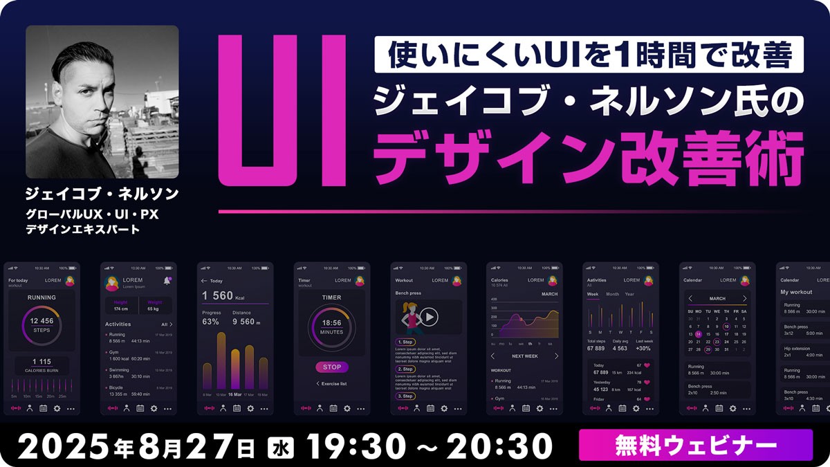 本ウェビナーでは、プロのUIデザイナーであるジェイコブ・ネルソン氏が、「使いにくいUI」を、わずか1時間で美しく、使いやすく生まれ変わらせる様子をライブでお見せします。