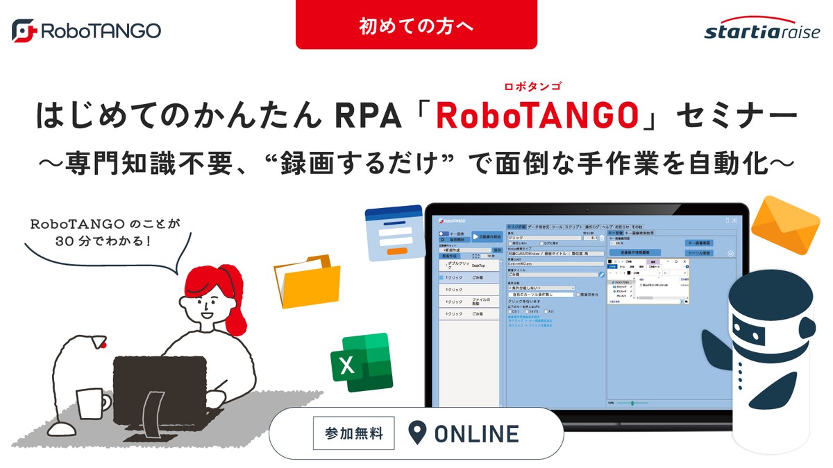 | タイトル | はじめてのかんたんRPA「RoboTANGO」セミナー ~専門知識不要、“録画するだけ”で面倒な手作業を自動化~ |
