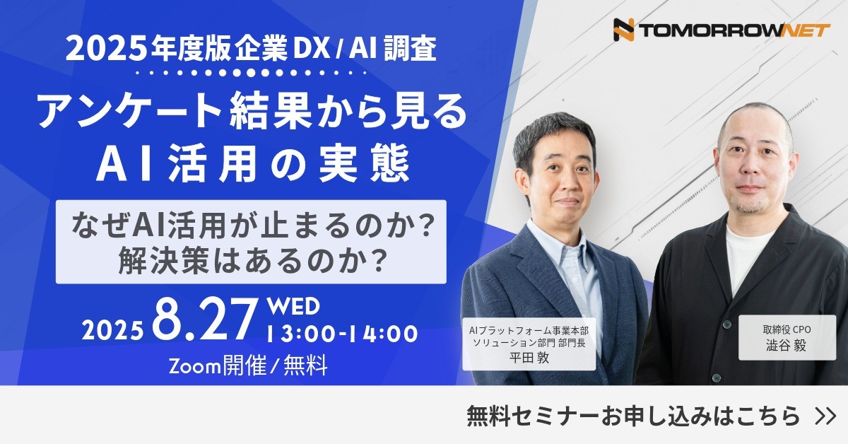 本セミナーでは、弊社が2025年5月に約1,000名に実施した企業のAI活用実態に関する調査結果をもとに、