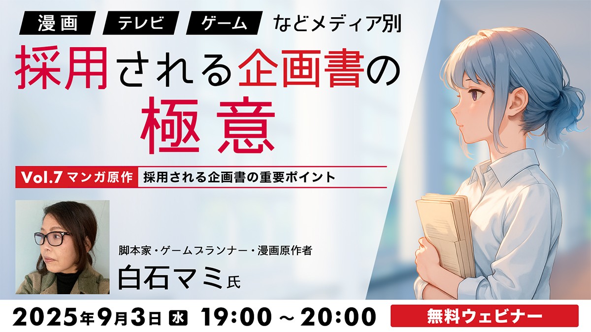 漫画、テレビ、ゲームといったエンタメ業界でジャンルを超えて仕事をするには、採用される企画書の制作が不可欠です。このウェビナーでは、テレビシナリオ・漫画原作・ゲームシナリオと、多岐にわたり活躍してきたクリエイターが、それぞれのメディアで必要とされるスキルと、採用される企画書の作り方について解説します。