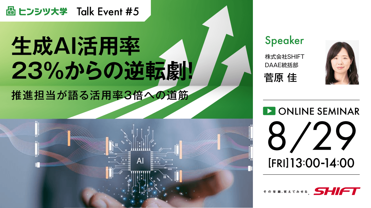 本セミナーでは、生成AIを社内で普及させるためにSHIFTが行った具体的な施策と、失敗談も踏まえた社内普及に向けた生の声をお届けします。