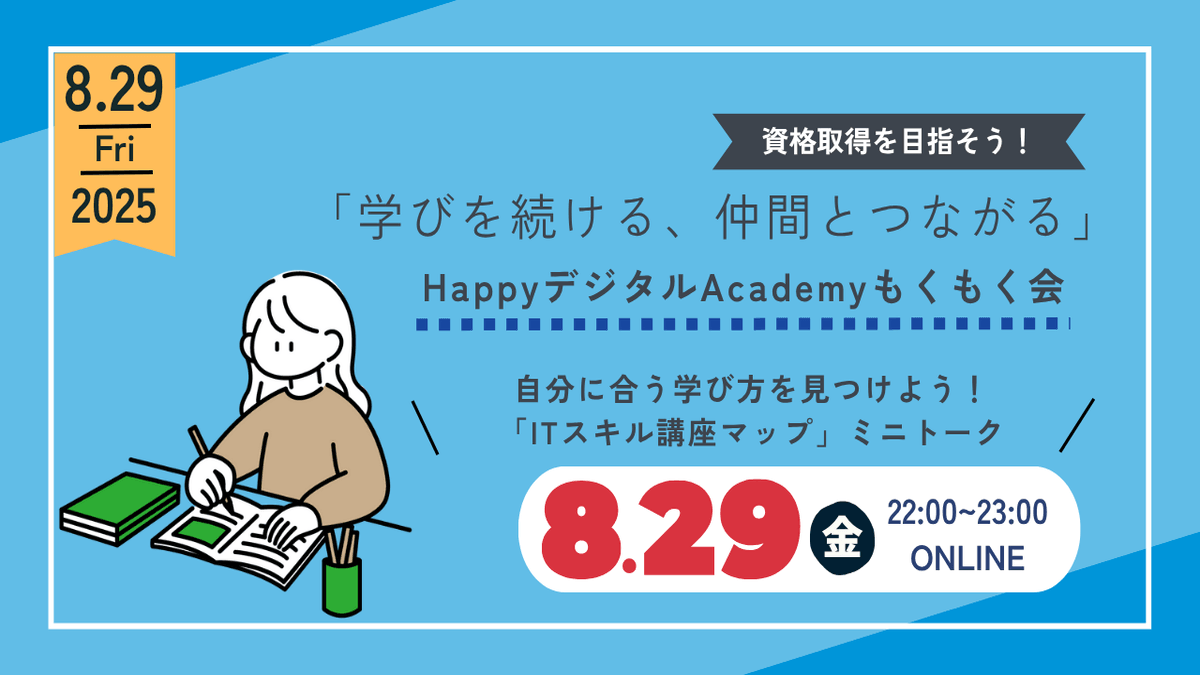【8/29(金)オンライン開催】自分に合う学び方を見つけよう!「ITスキル講座マップ」ミニトーク第11回 資格取得を目指そう!「学びを続ける、仲間とつながる」HappyデジタルAcademyもくもく会