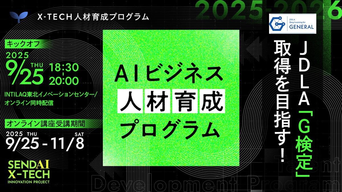 後援:日本ディープラーニング協会、CDLE宮城(JDLA「G検定」「E資格」合格者コミュニティ宮城支部)