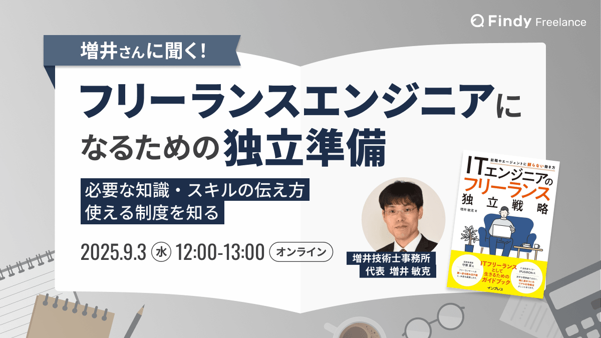 本イベントは、エンジニアとして独立した後、ITコンサルティングや執筆活動を行い、現在では30冊を超える著書を出版。2025年9月3日に『ITエンジニアのフリーランス独立戦略 前職やエージェントに頼らない働き方』を出版する増井さんにご登壇いただき、独立を視野に入れたエンジニアに向けて、独立前に学ぶべき知識、案件獲得のためのマインドセットなど、独立前後に必要となるあれこれを語っていただき、エンジニアとして独立を検討している方の悩みを解決するイベントを目指します。