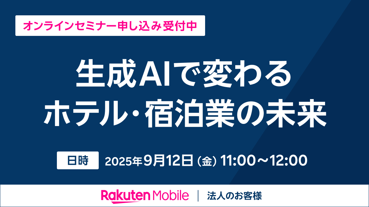 本セミナーでは、楽天モバイルが提供する「Rakuten AI for Business」を中心に、ホテル・宿泊業界における生成AIの活用事例を詳しく解説します。