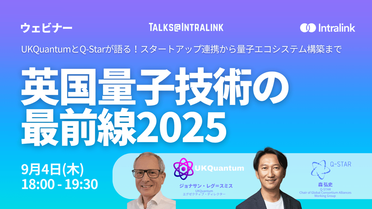 今回のTalks@ Intralinkでは、英国の量子エコシステムを牽引するUKQuantumと、日本から量子テクノロジー分野の先端を担うQ-Starをゲストに迎え、日英間での連携の可能性と戦略について深掘りします。