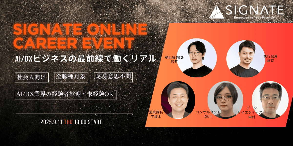 このイベントは、SIGNATEで活躍するデータサイエンティストやAIエンジニア、コンサルタントが、「顧客のDX推進の伴走と共に、自身もAI人材へと成長する」リアルな仕事内容を語る勉強会です。