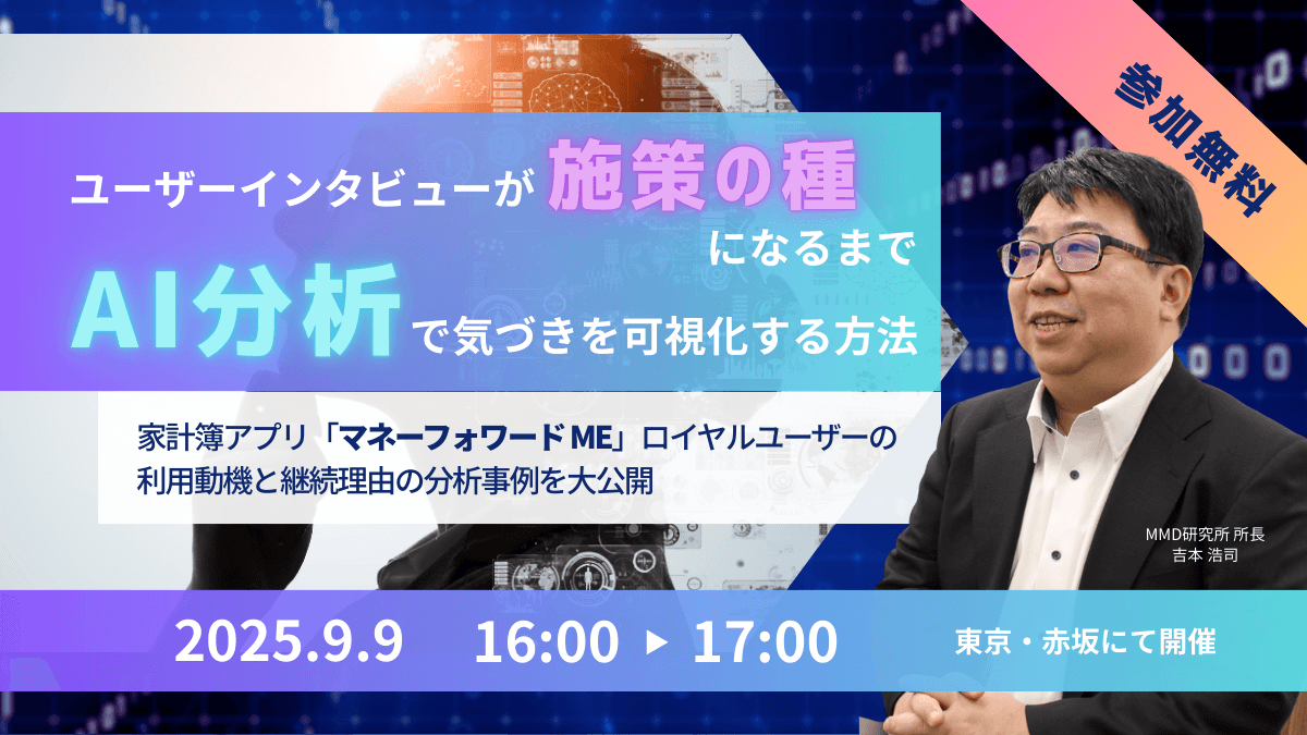 本セミナーでは、MMD研究所が独自に実施したマネーフォワード MEのユーザーインタビュー調査を題材に、顧客の発言をどう読み解き、どのように構造化・可視化し、施策に結びつく気づきを得るのか──そのプロセスを、実際のインタビュー発言の抜粋とともにご紹介します。