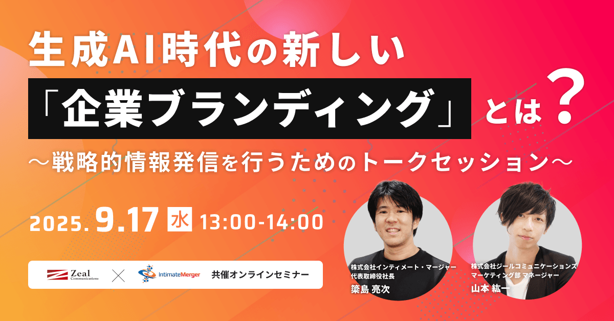 今回のトークセッションは、デジタルリスク対策やマーケティング領域で実績を持つ株式会社ジールコミュニケーションズ 山本 紘一氏とインティメート・マージャーの簗島が登壇。現場の具体的な事例を交えながら、AI時代におけるブランドの守り方・育て方を深掘り、AI時代に求められる新しいブランディングの形を探ります。