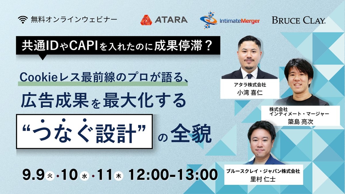 Cookieレスの本質的な課題と解決策については、マーケティングテクノロジーの実装支援に強いアタラ、データ活用のプロである インティメート・マージャー、SEO/広告の実務支援に定評のある ブルースクレイジャパン の3社が徹底解説します。