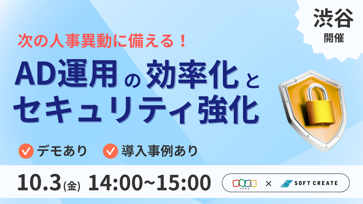 ソフトクリエイト主催セミナー「【渋谷開催セミナー】次の人事異動に備える!AD運用の効率化とセキュリティ強化 ~デモ・導入事例でわかりやすく解説~」の詳細についてはこちらをご覧ください。