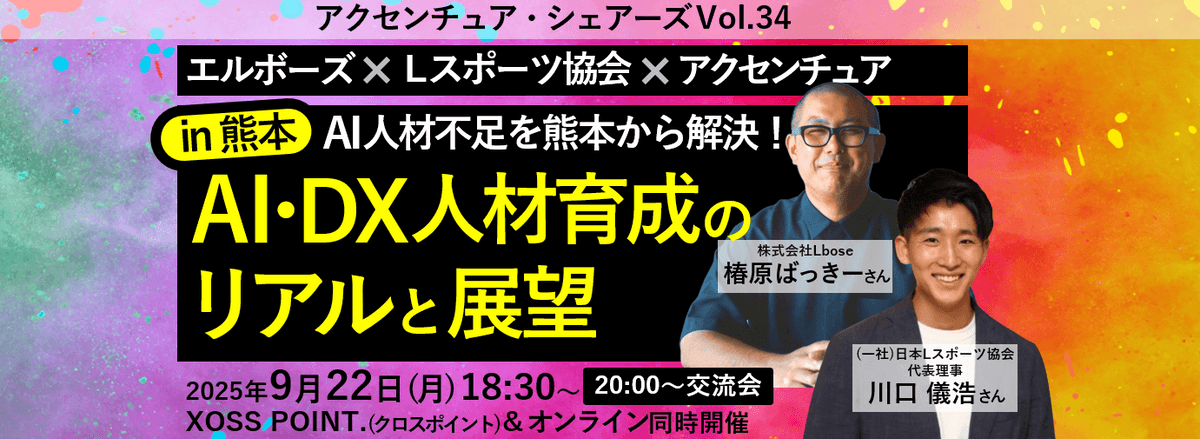 | 18:30~20:00 | アクセンチュアシェアーズ Vol.34『AI・DX人材育成のリアルと展望 in 熊本』 |