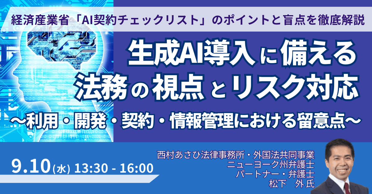 本セミナーでは、経済産業省が公表した「AIの利用・開発に関する契約チェックリスト」を中心に、生成AIを活用する際に留意すべき契約上のポイントを整理し、個人情報保護、セキュリティ、規約改定などの法的論点についても解説します。また、チェックリストでは十分に触れられていない実務上の課題についても取り上げます。